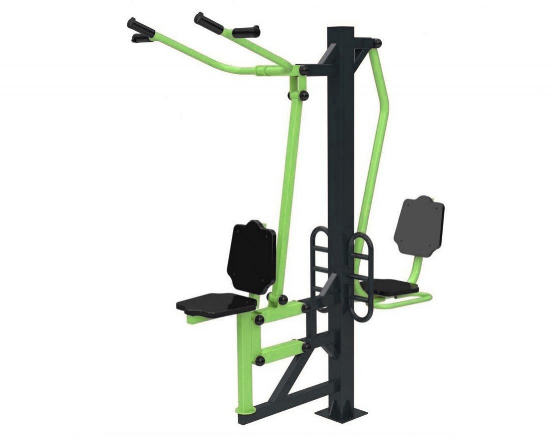 Тренажёр «Вертикальная тяга» предназначен для тренировки мышц трицепсов, бицепсов и грудных мышц. Он оснащён подвижной рычажной системой, которая обеспечивает безопасность и комфорт во время тренировки. Тренажёр изготовлен из прочной стали и имеет порошковое покрытие, устойчивое к атмосферным воздействиям.