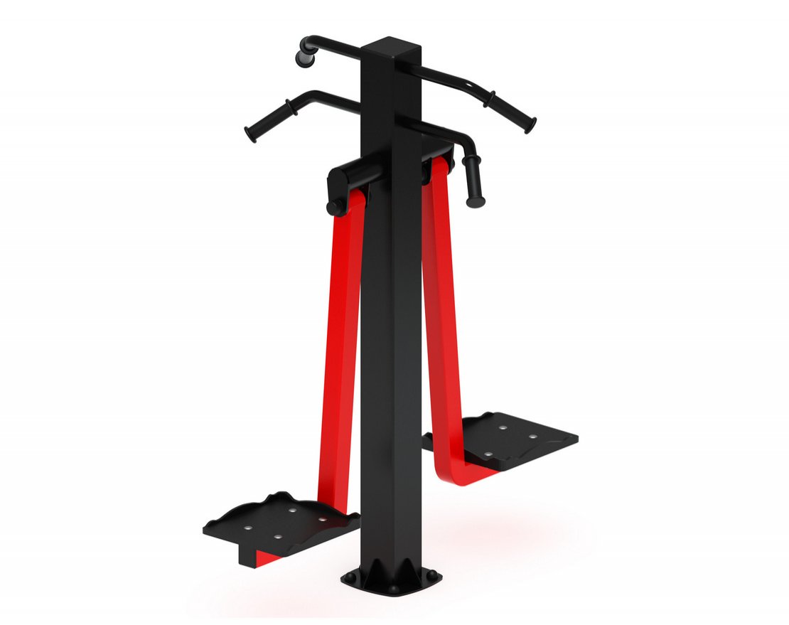 Тренажёр выполнен в красном цвете (RAL 3002). В качестве контрастного цвета используется чёрный (RAL 9005). Такое сочетание цветов выглядит ярко и динамично, оно будет привлекать внимание детей и взрослых.