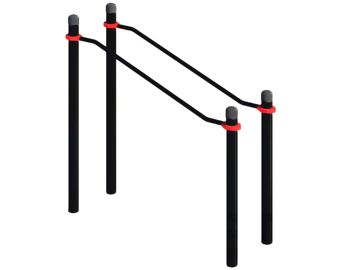 Комплекс включает в себя четыре опорных столба высотой 2 метра и 1,2 метра, а также две жерди длиной 1,79 метра. Брусья расположены на расстоянии 60,8 сантиметра друг от друга.