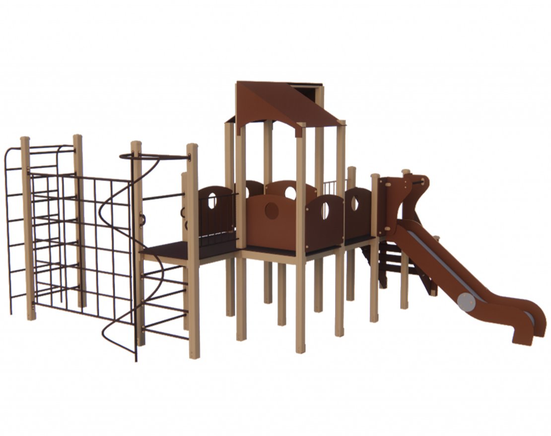 Игровой комплекс «Игровой комплекс» — это многофункциональное оборудование для детских площадок, которое предназначено для детей от 5 лет. Комплекс изготовлен из высококачественных материалов: берёзовой влагостойкой фанеры ФСФ 2/2, стали марки Ст3 и клеёного бруса. Оборудование соответствует стандартам безопасности и имеет зону безопасности 9660 х 8547мм.